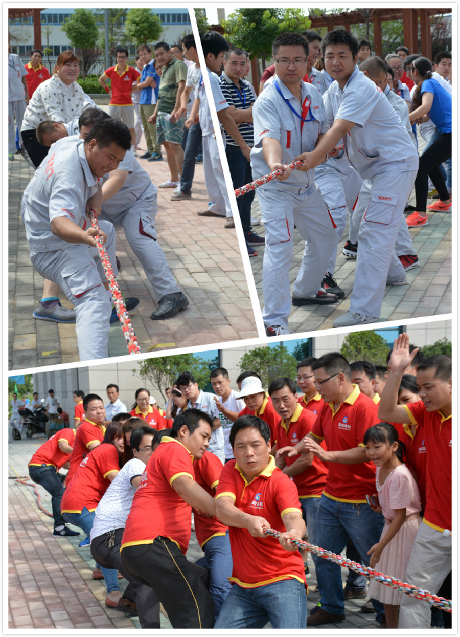 拔河比賽首場(chǎng)比賽由嵩陽(yáng)煤機(jī)刮板機(jī)隊(duì)和TATA木門木工隊(duì)進(jìn)行,隨著裁判“開始”口令聲落,競(jìng)技雙方隊(duì)員同時(shí)發(fā)力,緊握手中的繩子,勒繩下腰,降低重心,齊心協(xié)力往后拉。熱情的煤機(jī)啦啦隊(duì)不顧天氣的炎熱,為自己的隊(duì)伍助威吶喊。